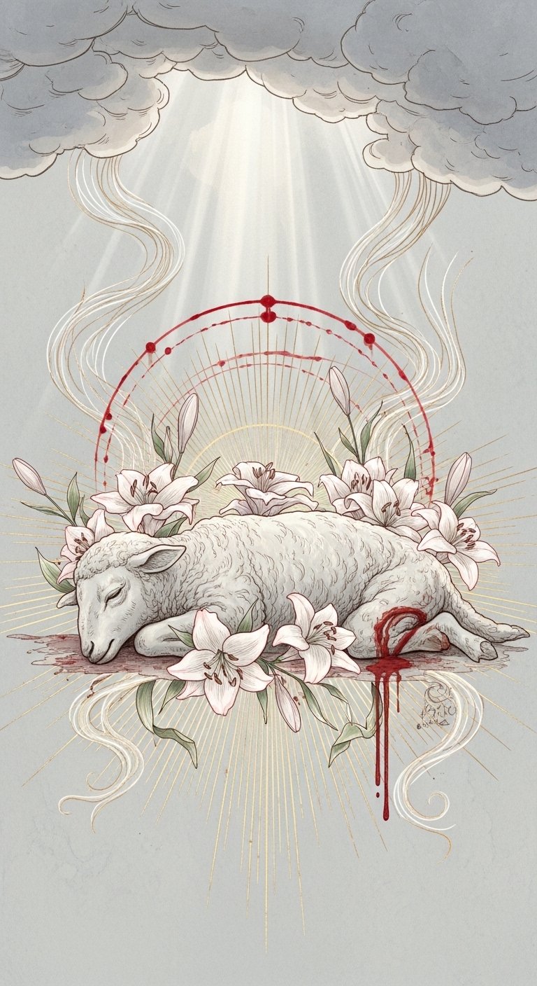 The design balances sorrow and serenity—lilies and soft light evoke purity and new beginnings while the subtle halo of red and gold underscores sacrificial love and spiritual awakening.