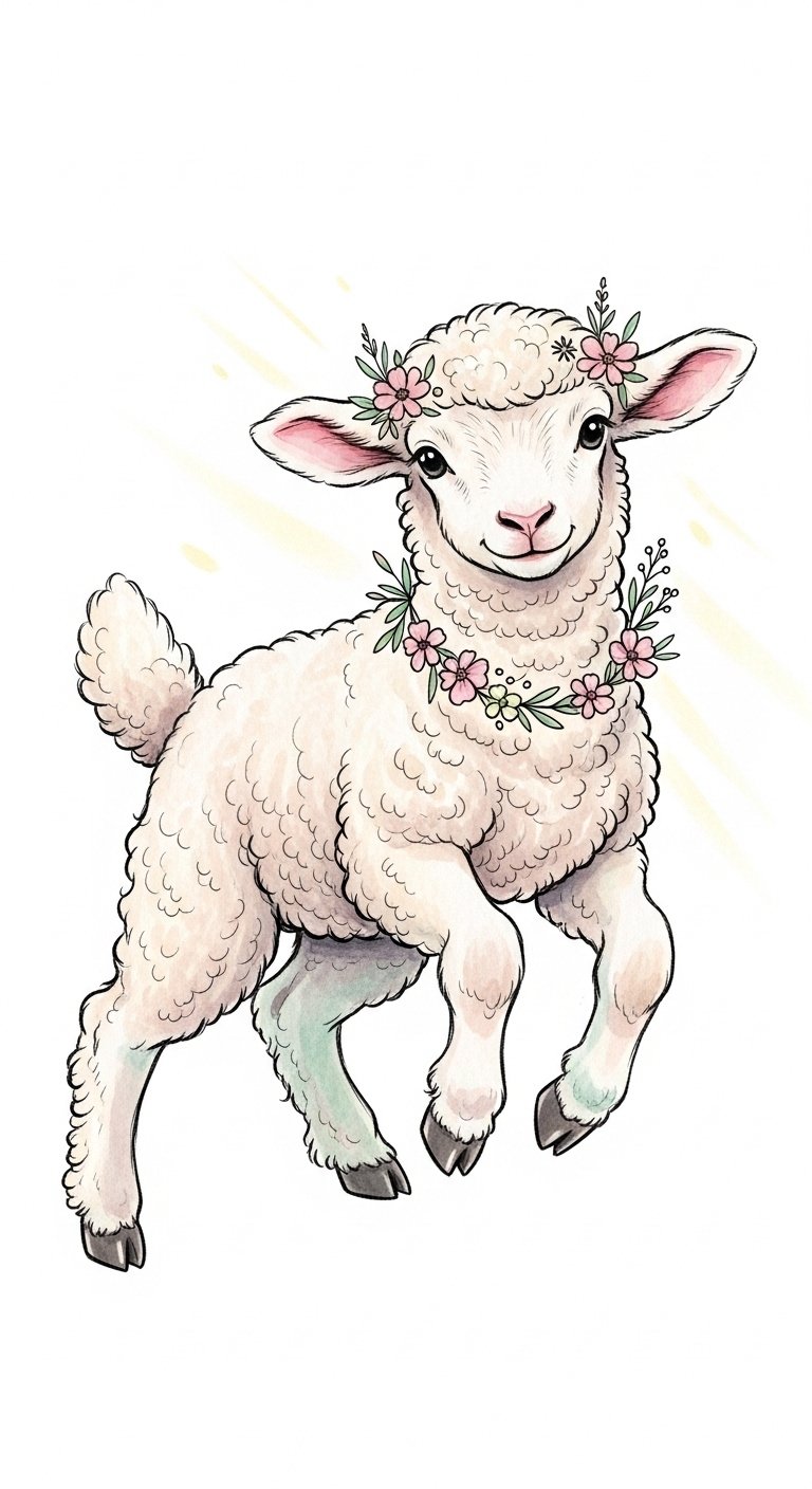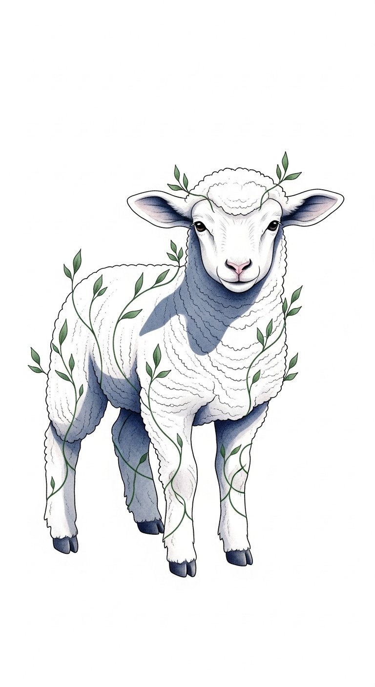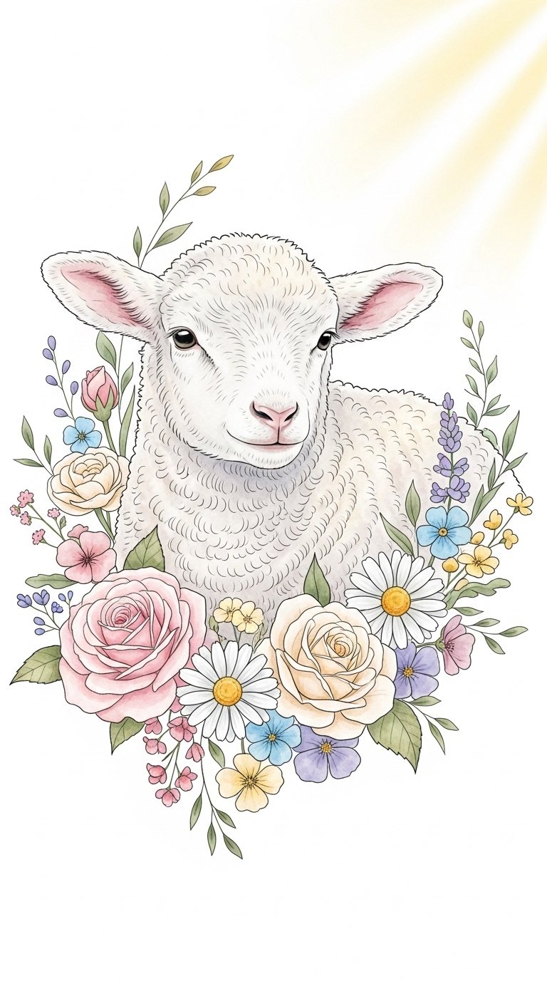 This design evokes peaceful simplicity and heartfelt connection—soft linework for the lamb, delicate color washes for flowers, and subtle background shading for rolling hills or distant peaks to keep focus intimate.