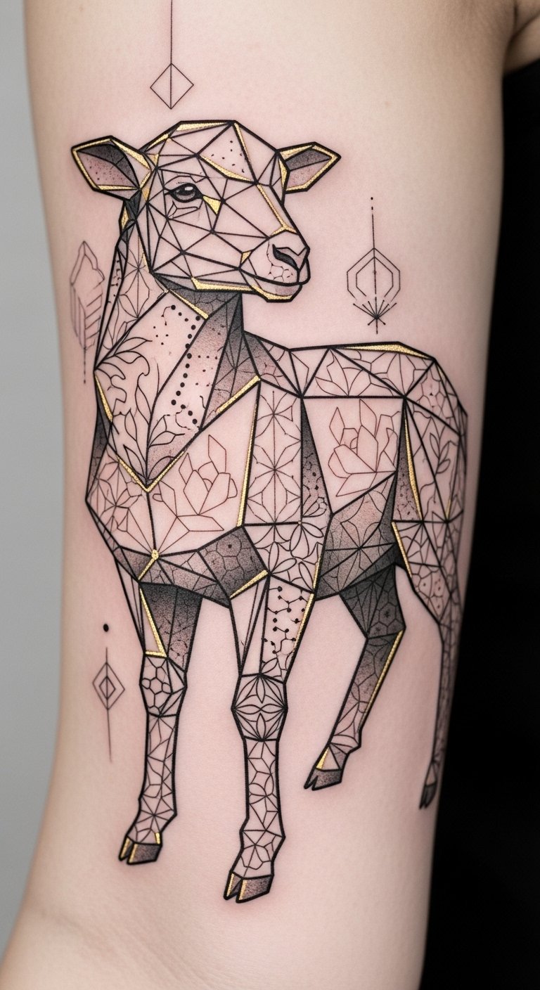 Imagine intricate geometric patterns melding together, creating a visual symphony. With creative shading enhancing depth, your lamb tattoo becomes a statement of individuality, freedom, and artistic expression—perfectly showcasing your passion for the unconventional.