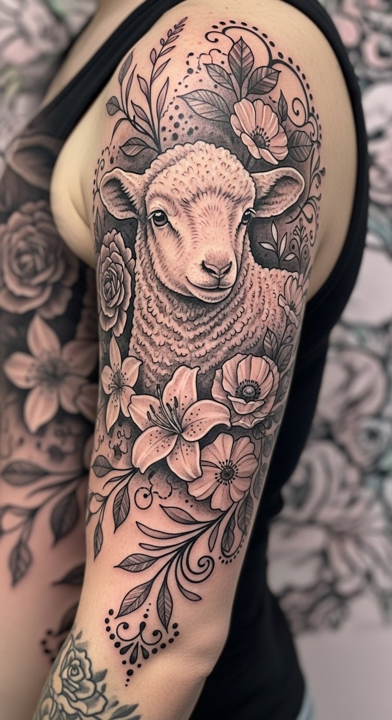 The lamb symbolizes innocence, gentleness, and renewal while the surrounding florals and foliage represent growth, resilience, and the cycles of nature; together they convey a serene yet strong emotional narrative suited to a half-sleeve where the arm’s contours enhance the flow of the composition.