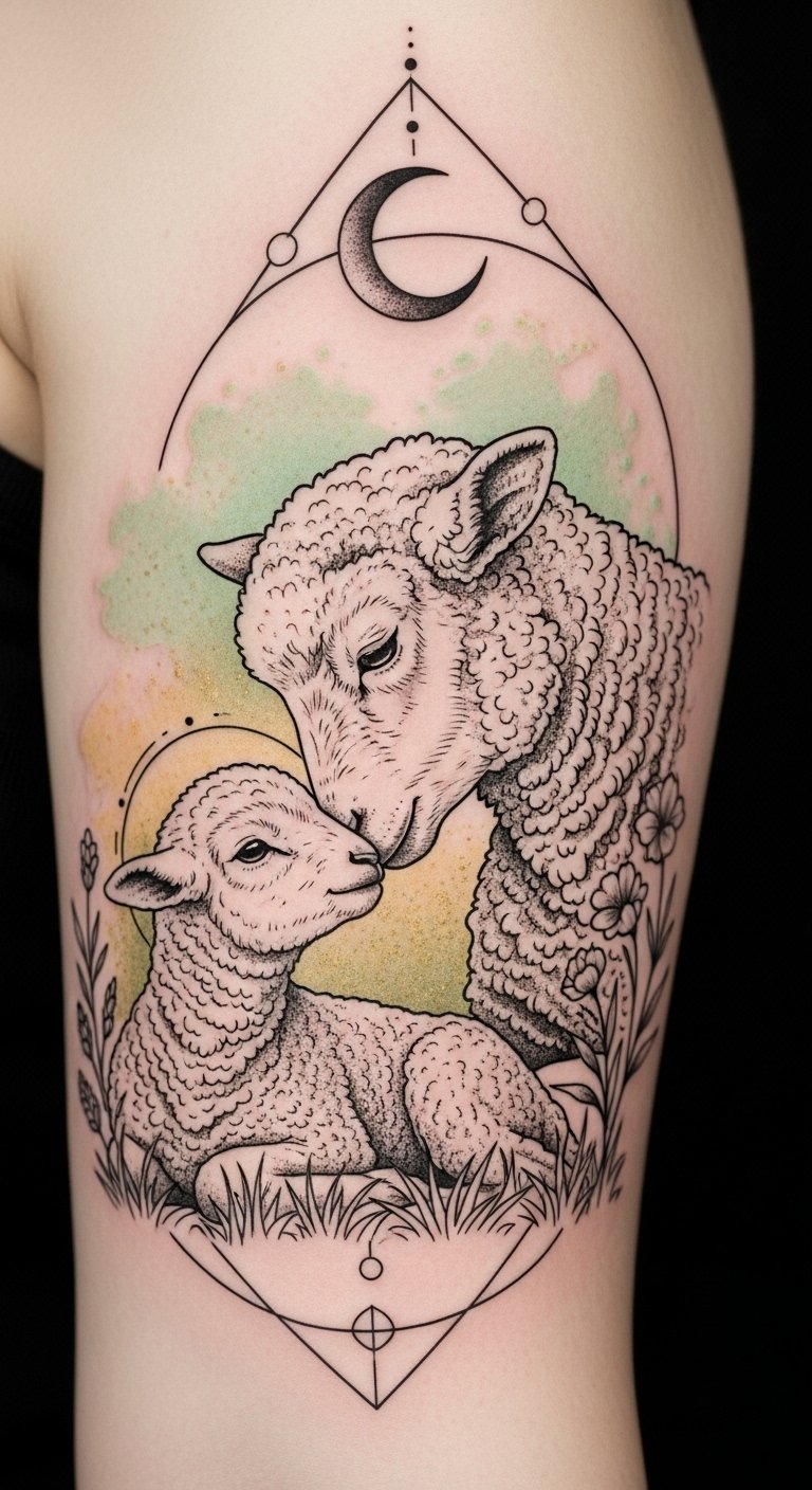 While exploring tattoo ideas, the image of a mother lamb tenderly caring for her young evokes deep feelings of nurture and protection. This beautiful design captures the nurturing bond and showcases maternal instincts in a profound way.