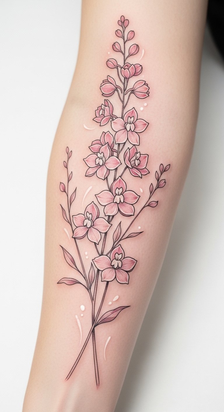 When you choose to ink larkspur on your forearm, you’re not just selecting a design; you’re embracing a symbol of joy and love that resonates with your personal journey.
