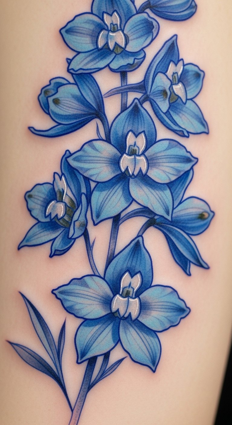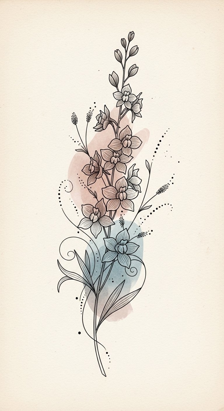 A vibrant indigo larkspur piece bursts with life, capturing the eye with its rich hues and intricate details. This stunning tattoo embodies vibrant color symbolism, representing joy and positivity. Inspired by larkspur folklore, it invites you to embrace freedom and spontaneity. Each delicate petal weaves a story of beauty, making this piece a perfect tribute to your adventurous spirit. Symbolically, the indigo tones emphasize intuition and depth while the light, airy composition conveys movement and liberation; emotionally it reads as hopeful, playful, and slightly wistful. Ideal placement is a vertical canvas such as the forearm, ribcage, or outer thigh where the elongated stems can follow natural contours and allow the fine-line details and watercolor gradients to be appreciated up close.