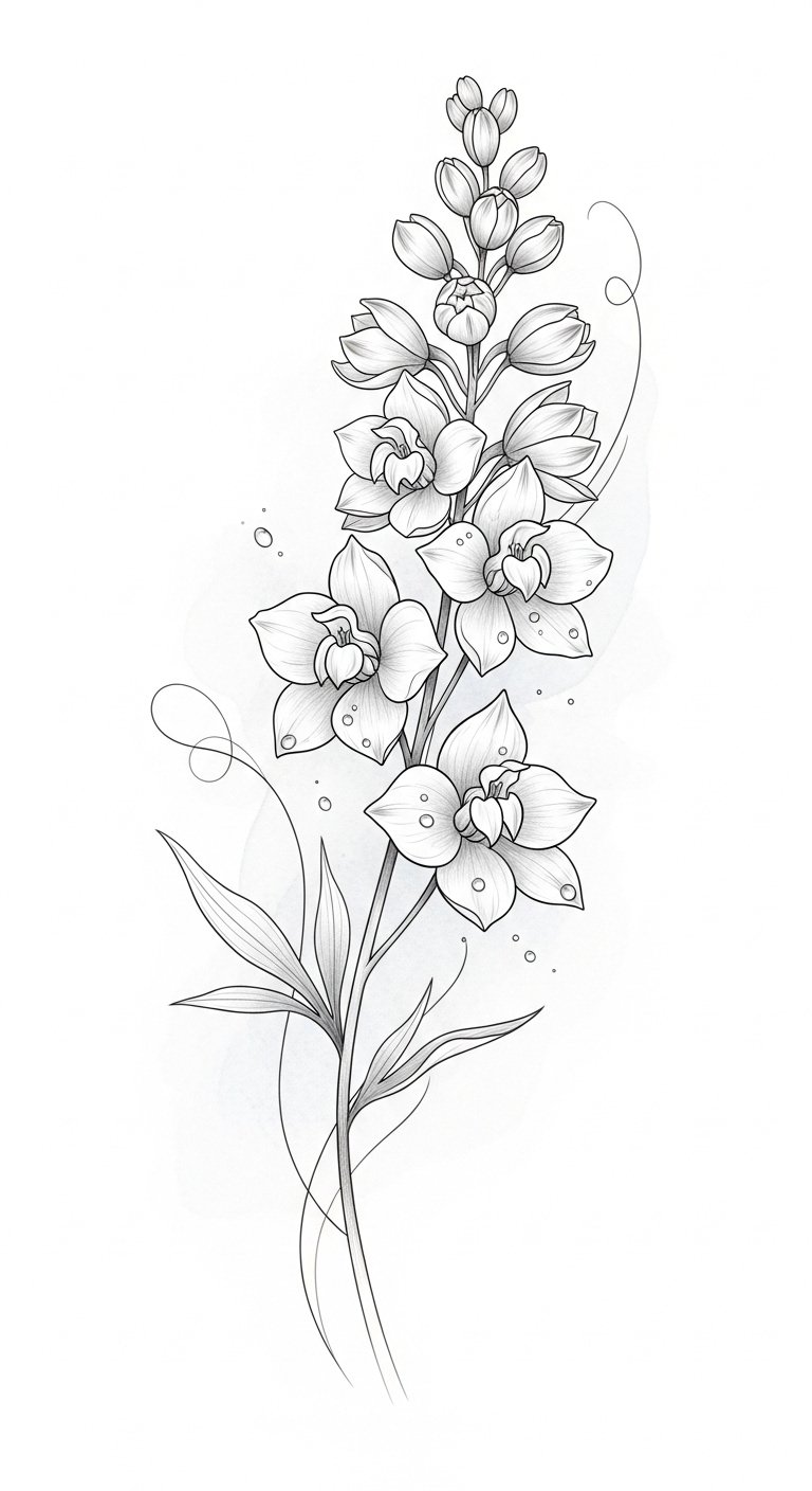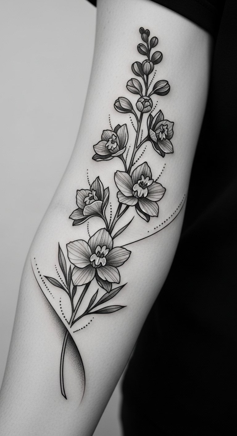 For those who appreciate a more classic approach to body art, black and gray larkspur designs offer a timeless elegance that speaks volumes.