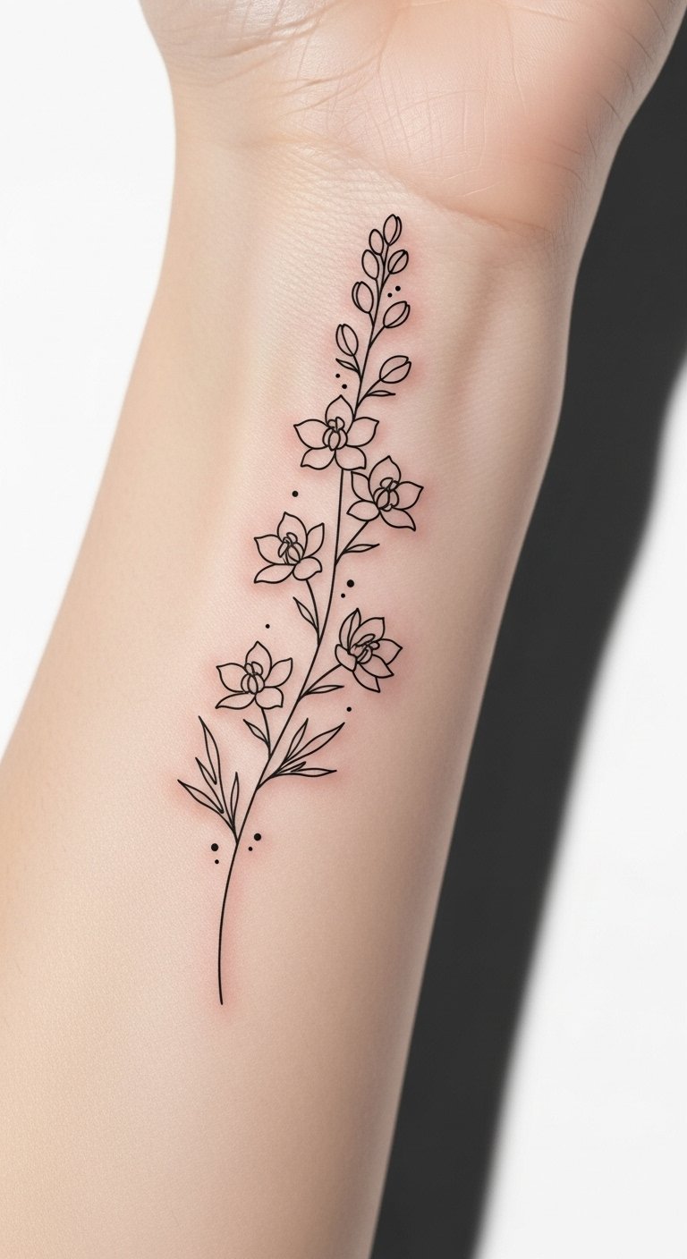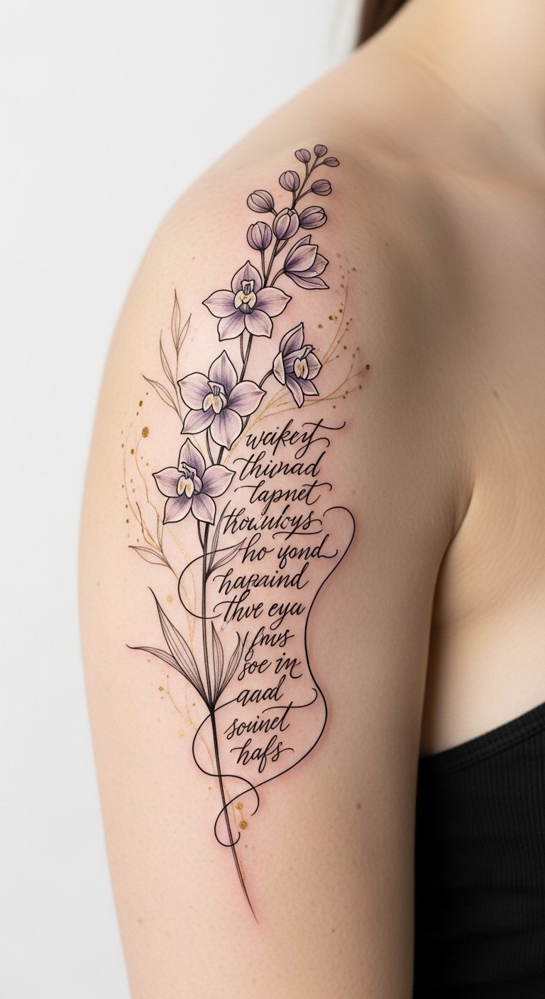 The larkspur’s upward-reaching blooms suggest hope and openness, and pairing them with a quote adds emotional specificity—choose placement like the shoulder blade, ribcage, or forearm to allow the spray to follow the body’s contours; soft watercolor and fine-line elements convey vulnerability and grace, while gold accents can highlight words or petals for emphasis, making the piece both intimate and visually uplifting.