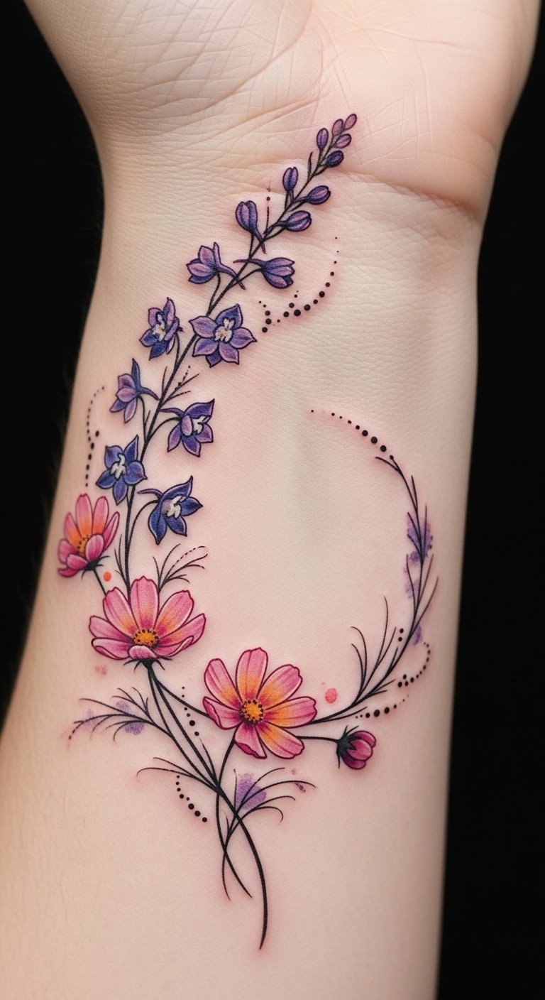 When combining larkspur and cosmos in a tattoo design, you create a stunning visual narrative that intertwines elegance and joy.
