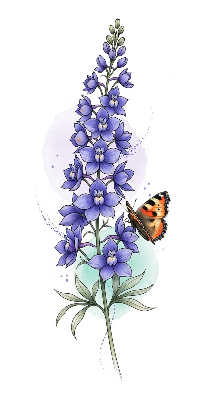 A graceful larkspur stem rendered in layered cool blues with soft gradients and delicate linework, gentle watercolour washes around the petals, subtle white highlights, faint misty background, fine stippling for texture, small airy butterflies or birds accenting the bloom, suitable for forearm, ribcage, or shoulder blade to evoke calm, emotional healing, harmony, and a balanced, free spirit.