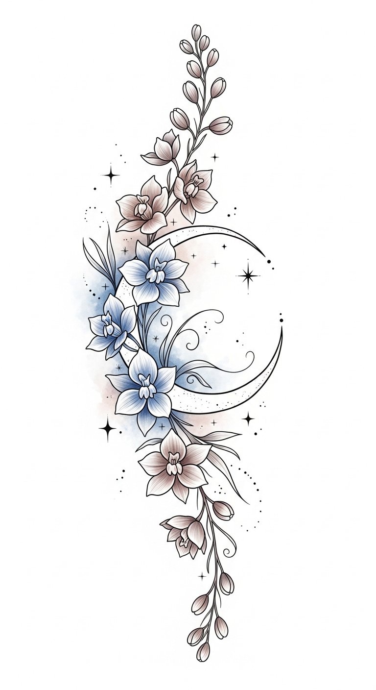 Larkspur tattoos entwined with a crescent moon create a mesmerizing fusion of nature and celestial beauty, inviting you to explore the depths of your dreams and aspirations.