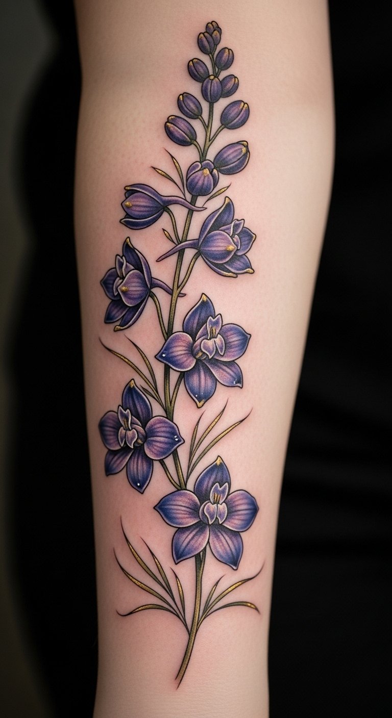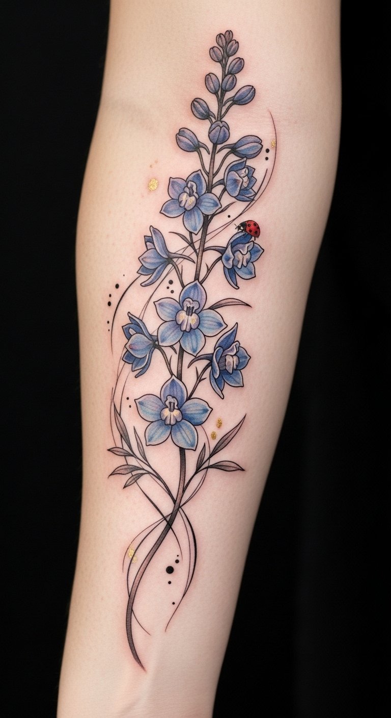 The larkspur design captures individuality through its graceful stem and layered petals, blending vivid color and fine-line detail to evoke joy, growth, and transformation; the dewdrops add tenderness while the golden thread symbolizes a personal journey or connection, and the piece suits inner forearm, shoulder blade, or ribcage placement where its vertical flow complements the body’s contours and allows for both intimate visibility and private meaning.
