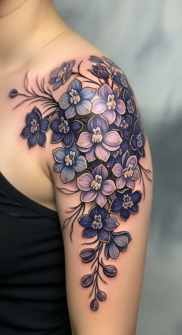 A shoulder tattoo featuring larkspur can elevate your body art to new heights, offering a broader canvas that captures the flower’s enchanting beauty.