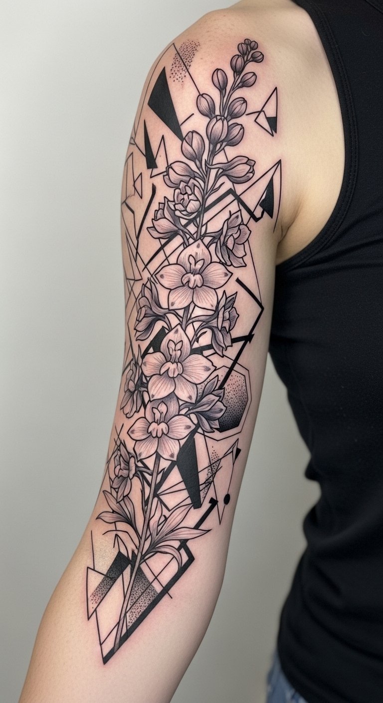 This design symbolizes the balance between softness and strength — the larkspur’s slender stems and blossoms convey grace and openness, while the geometric elements add structure and contemporary edge; emotionally it suggests liberation, personal growth, and a confident embrace of one’s identity.