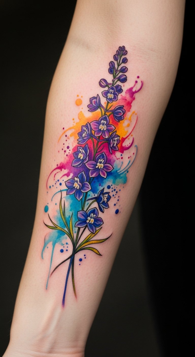 Watercolor larkspur tattoos symbolize lightness, freedom, and the ephemeral beauty of emotion; their soft washes and unpredictable splatters evoke fleeting moments, joy, and delicate resilience.