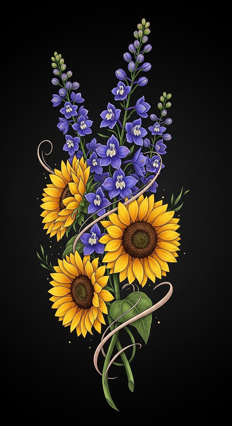 Symbolically the larkspur brings joy, love, and positivity while the sunflowers add vitality, resilience, and bold self-expression; emotionally it reads as an open-hearted celebration and reminder to embrace freedom.