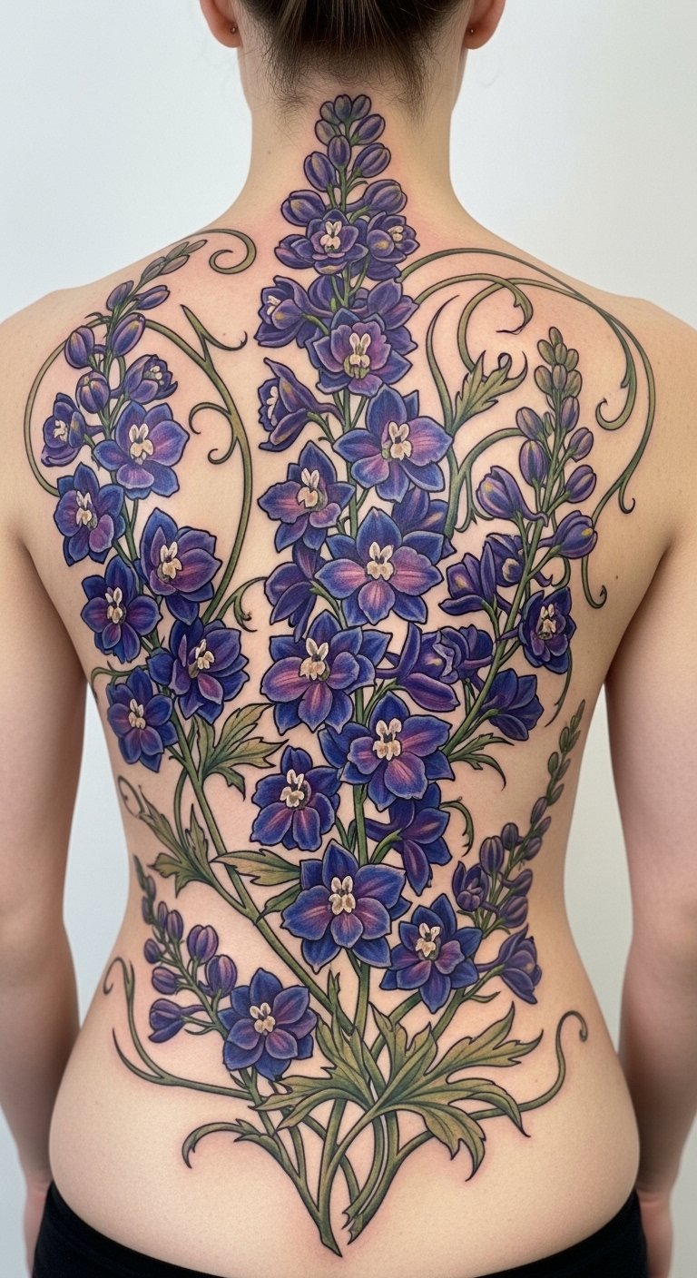 When placed across the upper and mid-back, this design uses flowing stems and layered clusters of larkspur to follow the spine and shoulder blades, evoking protection and openness; colors shift from deep indigo at the roots to soft lavender at the tips to suggest emotional growth and gentle joy.