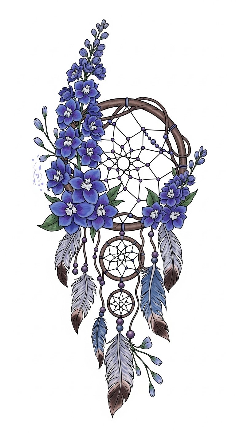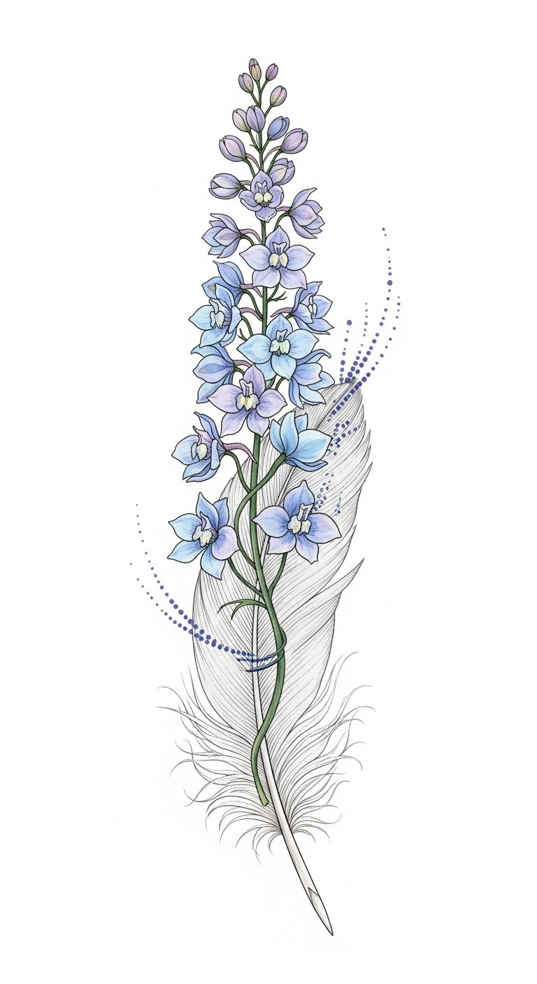 Larkspur symbolism, representing joy and positivity, intertwines beautifully with feather design, embodying freedom and lightness.