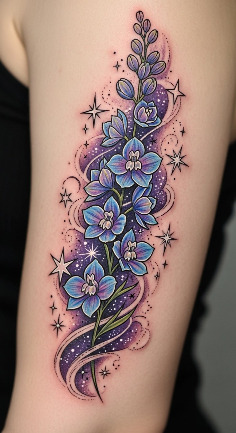 As you consider this larkspur-and-stars tattoo, the symbolism centers on love, joy, aspiration, and openness—flowers grounding the piece in warmth and stars pulling the gaze upward toward possibility.