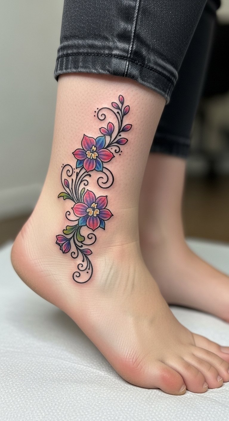 This ankle tattoo concept evokes lighthearted freedom and delicate strength: larkspur blooms symbolize positivity, an open heart, and a playful spirit, while the swirling stems suggest movement and continuity.