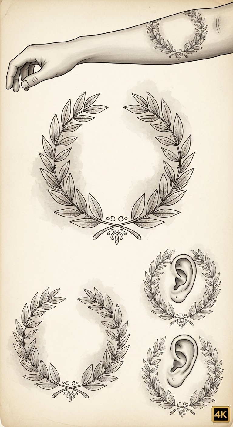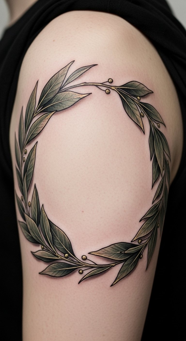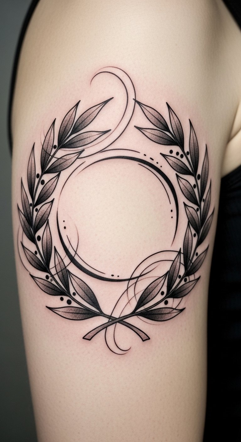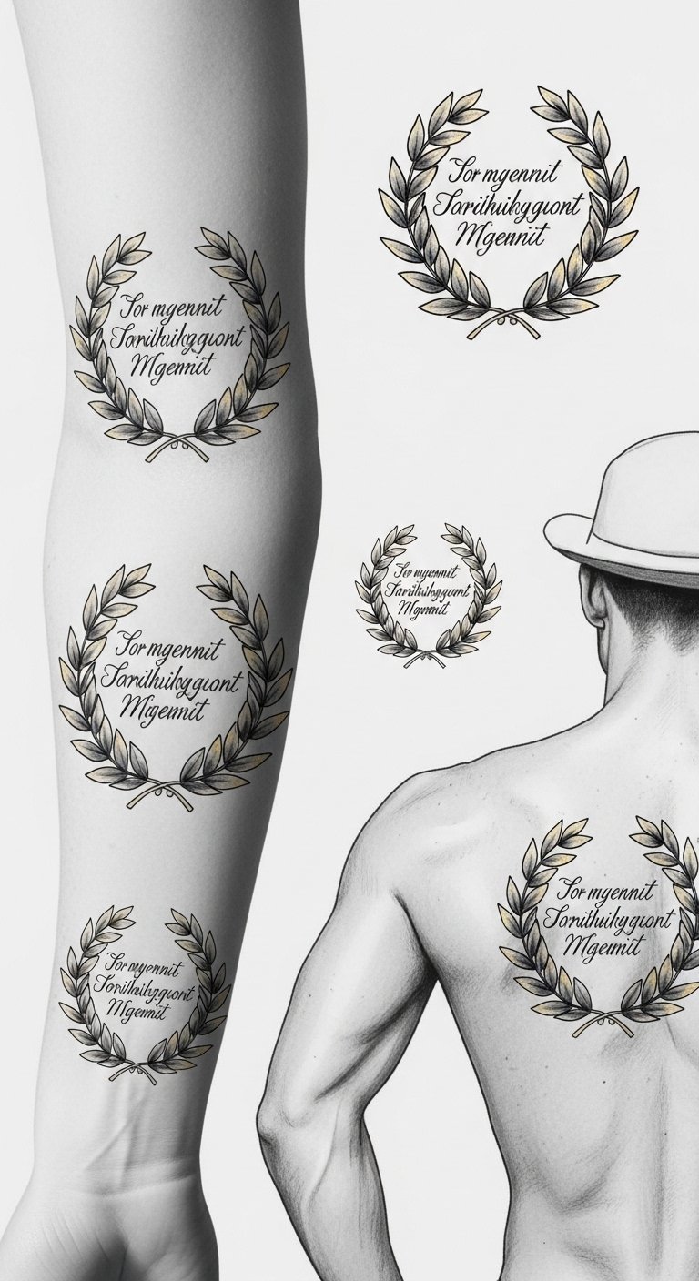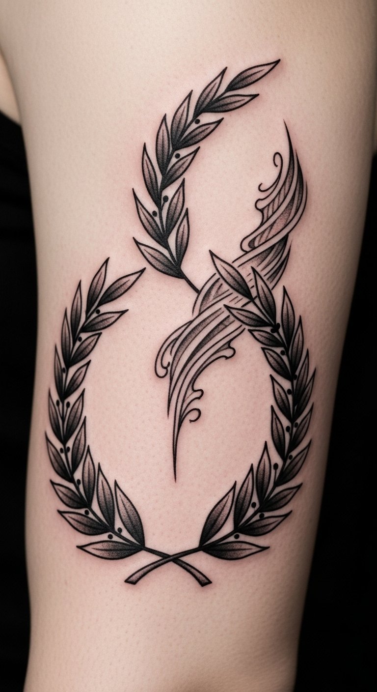 A laurel wreath encircling a forearm or upper shoulder, inked with a choice of styles—soft watercolor washes bleeding through delicate leaves for a spirited, celebratory feel; crisp blackwork for a resolute, timeless statement; or fine-line realism for understated elegance. Symbolically it conveys victory, honor, and personal growth; emotionally it evokes confidence, remembrance, and the quiet pride of earned achievement. Ideal placements include the inner forearm for daily reminder, the nape or clavicle for subtle elegance, or the chest near the heart for deeply personal significance.