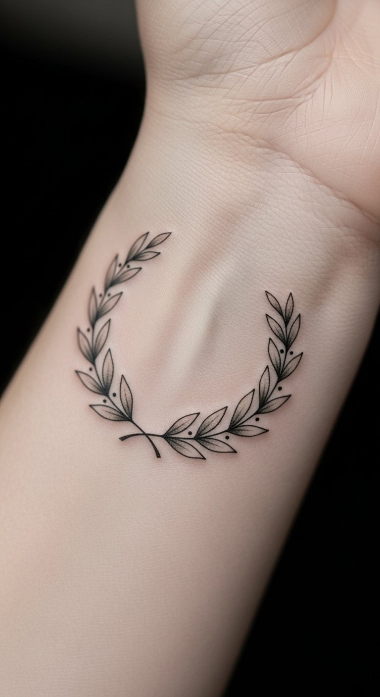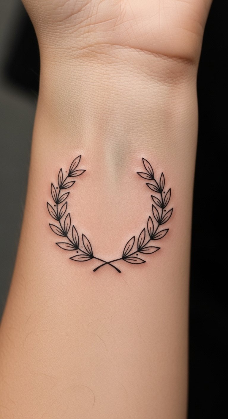 A minimalist laurel wreath tattoo offers a modern twist on a classic symbol, distilling the essence of victory into elegant simplicity.