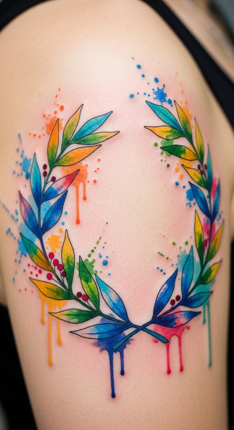 Colorful hues dance across your skin with a vibrant watercolor laurel wreath tattoo, transforming a timeless symbol of victory into a lively masterpiece.