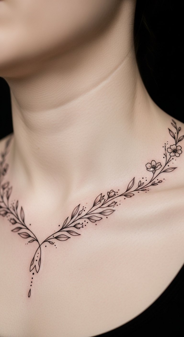 An elegant neck and collarbone wreath tattoo transforms your skin into a canvas of artistry, effortlessly blending beauty with symbolism.