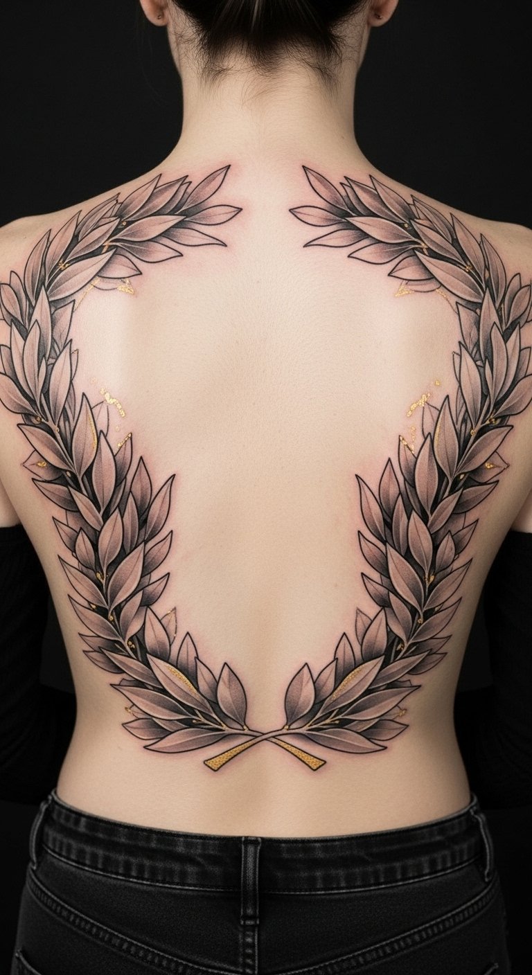 The large back laurel wreath design serves as a stunning statement piece, encompassing a vast area with intricate details and powerful symbolism.