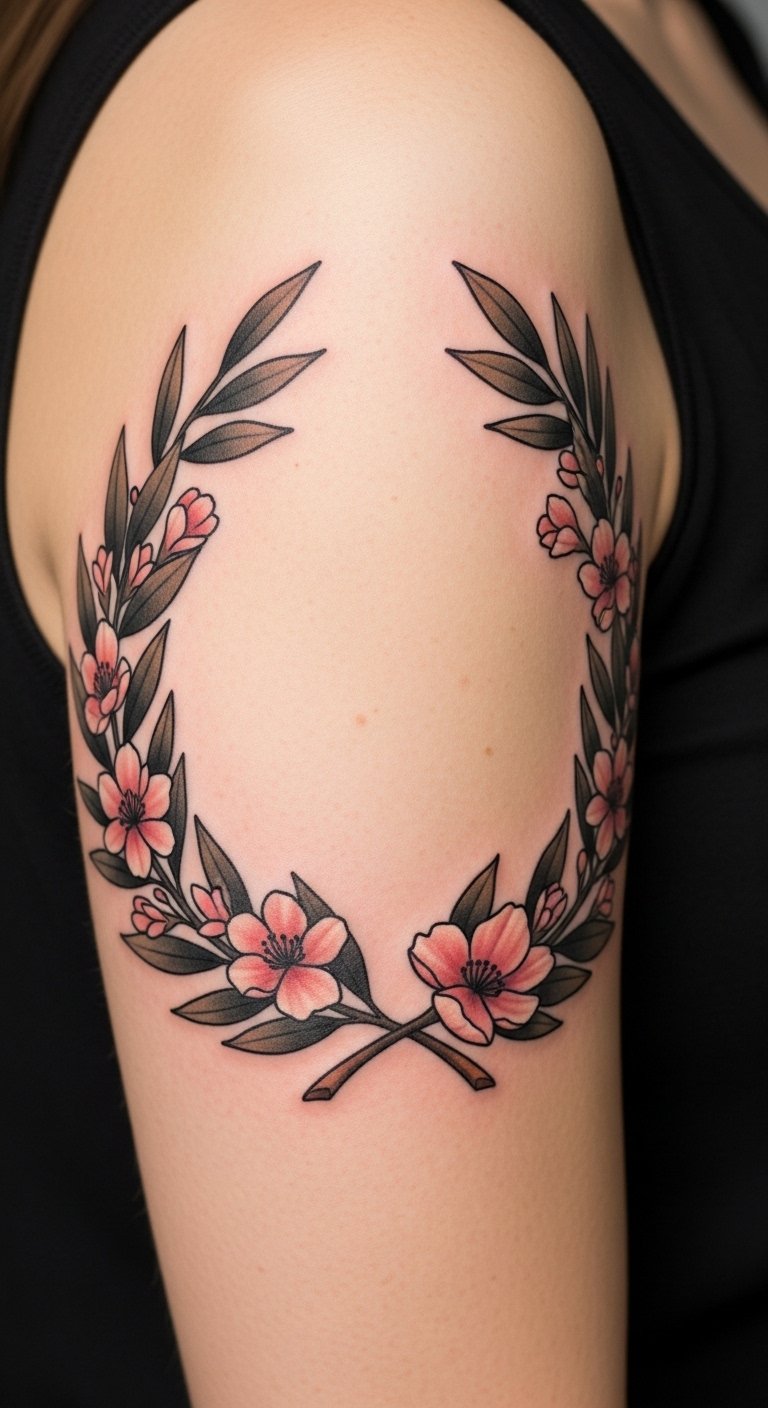 As you consider placement, think of areas where the circular flow of the laurel can complement body contours—around the upper arm, shoulder blade, or encircling the wrist or ankle—to convey strength and continuity; the floral accents soften the composition, adding warmth and vitality that evoke celebration, resilience, and personal triumph, while allowing room for color, shading, or fine-line detail to match the wearer’s emotional expression and sense of elegance.