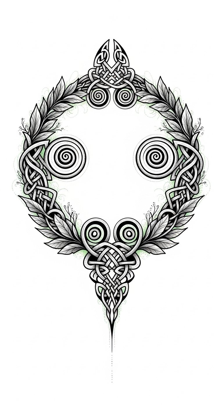 A Celtic inspired laurel wreath design weaves together intricate knots and spirals, creating a tapestry of rich symbolism and heritage. Each element, from the Celtic knotwork to nature motifs, reflects deep historical significance.