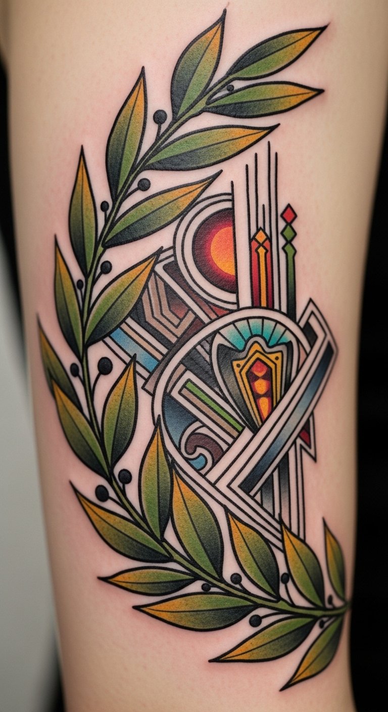 The symbolism blends classical honor (laurel) with contemporary order (geometry), evoking balance between tradition and personal evolution; emotionally it reads as confident yet introspective.
