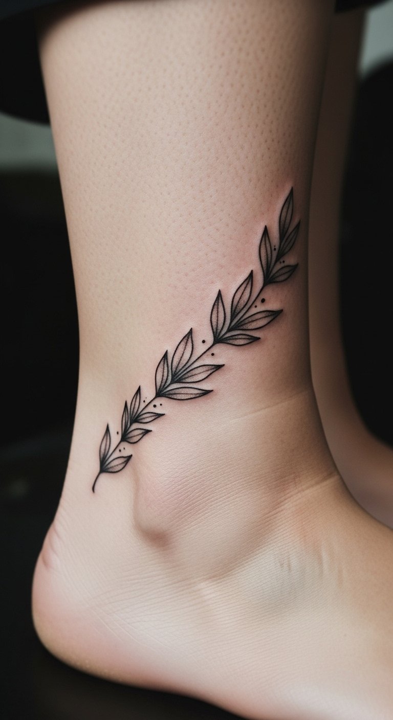 The gentle curve around the ankle suggests continuity and protection, while the fine details of each leaf evoke care, growth, and personal triumph.