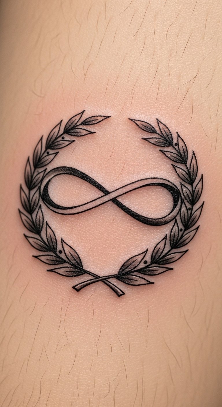 The laurel wreath and infinity symbol together embody victory, continuity, and resilience; place this design on the inner forearm for visibility and personal affirmation, on the upper back or between the shoulder blades for a more private, centered statement, or on the chest near the heart to emphasize emotional significance.