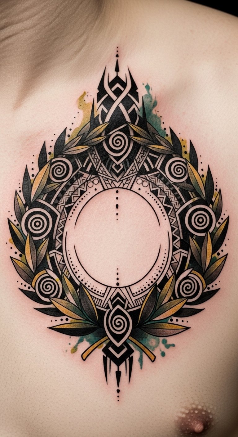 The tattoo design concept blends layered textures and vibrant color variations into a laurel wreath encircling a small central motif (a quill, compass, or crescent), using mixed-media-inspired shading to mimic collage, watercolor washes, and subtle metallic highlights; symbolism focuses on victory, creativity, cultural continuity, and collaborative spirit, evoking pride and contemplative energy; ideal placement is the upper forearm or chest where circular motion complements anatomy and allows visible layering detail, inviting personal narrative and conversation.