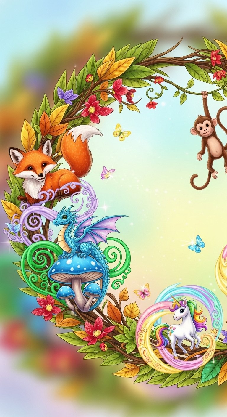 With smaller elements (feathered birds, fox, stag, and a tiny dragon) positioned to balance negative space and invite close viewing for the playful details.