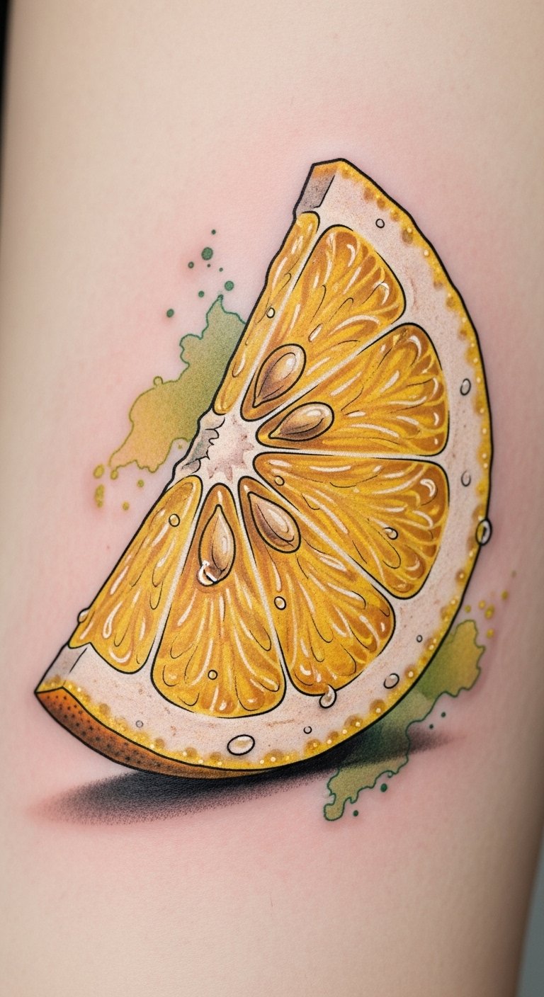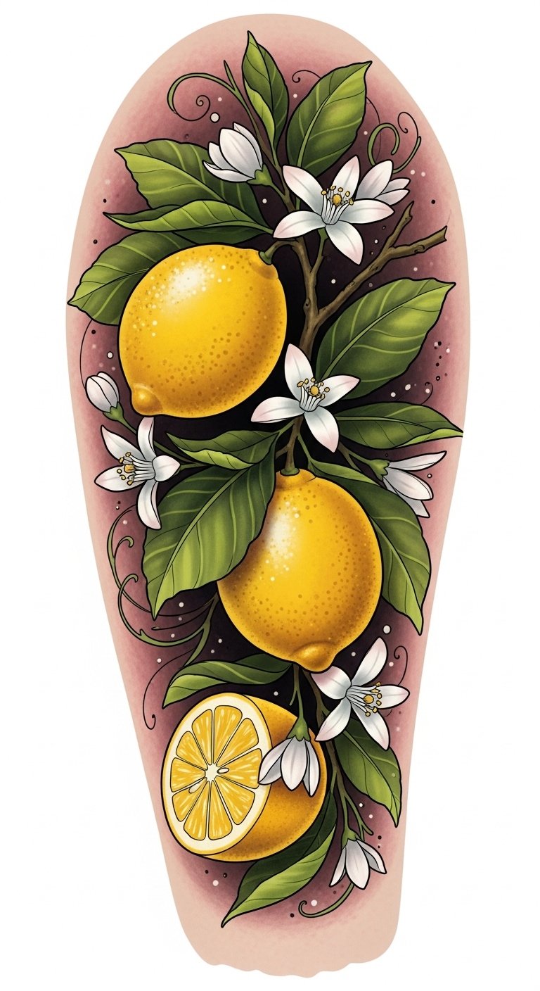 This tattoo embodies lemon symbolism—representing freshness and energy. The bold lemon color pops, reflecting its health benefits, rich history, and cultural importance, inspiring creativity in lemon art, crafts, and delightful recipes.