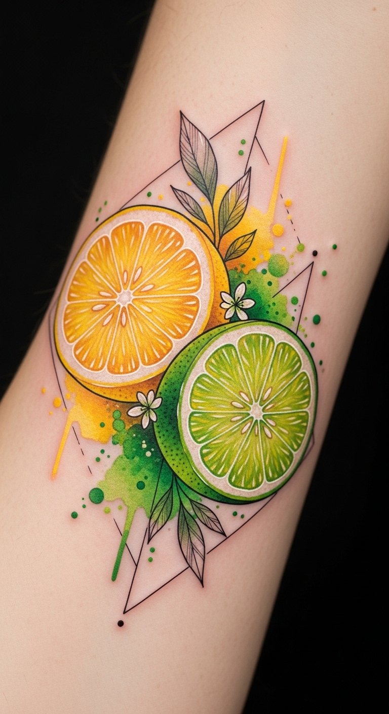 A colorful lemon watercolor tattoo bursts with vibrancy, capturing the essence of this lively fruit in a playful and artistic manner. Using watercolor techniques, your tattoo can showcase vibrant colors that blend seamlessly, creating a dreamy effect.