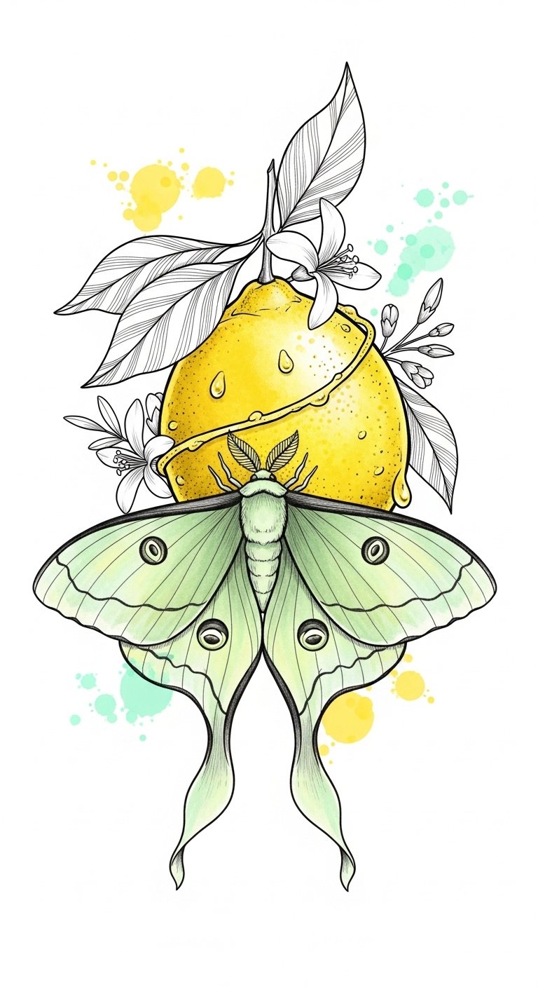 Combining the lively essence of citrus with the mystical allure of the lunar moth creates an enchanting tattoo concept that resonates deeply with those who appreciate the beauty of nature’s contrasts.