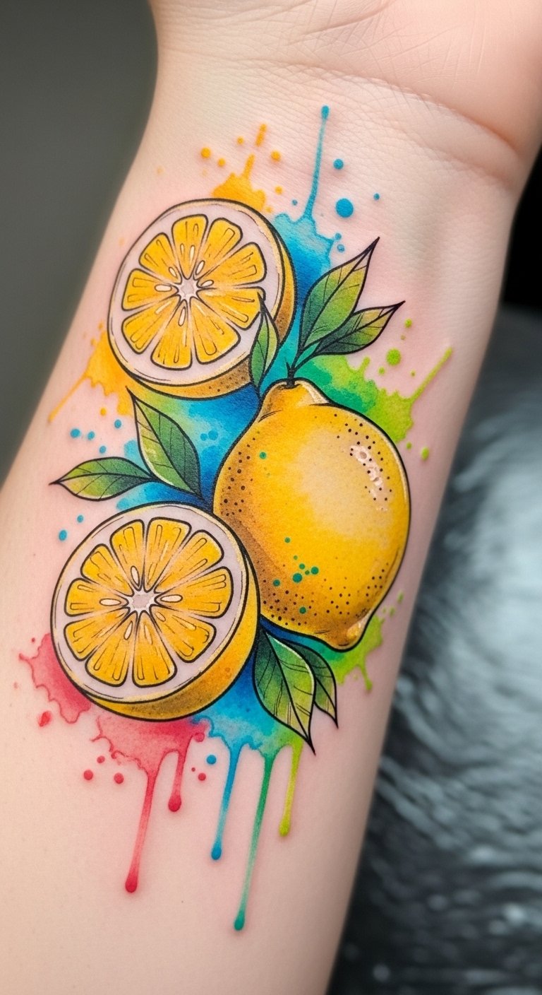 Ideal placements include the forearm, calf, or shoulder blade where the curve of the lemon can follow natural contours; symbolism centers on renewal, energy, and a bright outlook, while the watercolor splash suggests fleeting moments and carefree emotion.