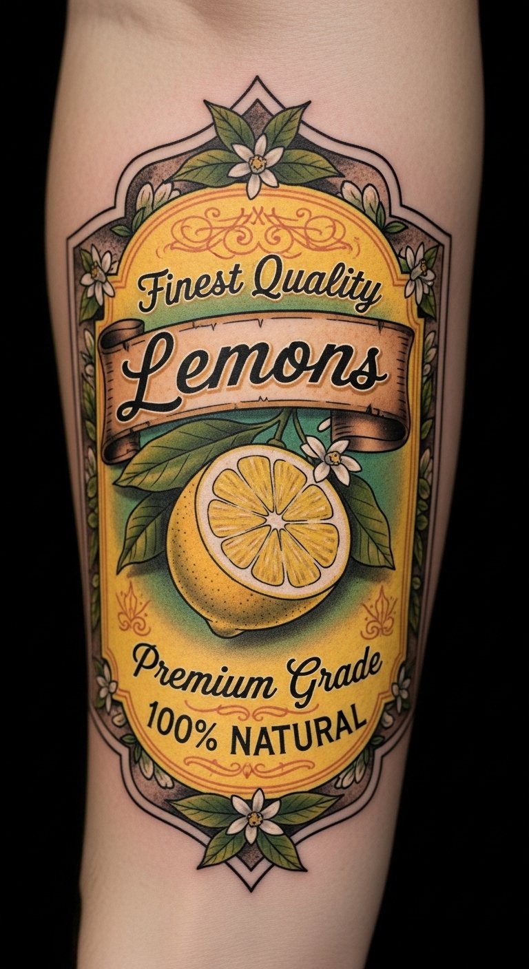 This concept transforms the vintage lemon label into a tattoo that symbolizes warmth, optimism, and a yearning for simplicity; bright yellows and distressed textures convey sunlight and aged charm, while ornate, flowing type evokes handcrafted care. Emotionally it balances playful nostalgia with confident boldness—ideal for someone who values history and joy. Suggested placement: forearm or upper shoulder where the rectangular label shape can wrap slightly, allowing the typography and citrus illustration to be read easily and to age gracefully with the skin.