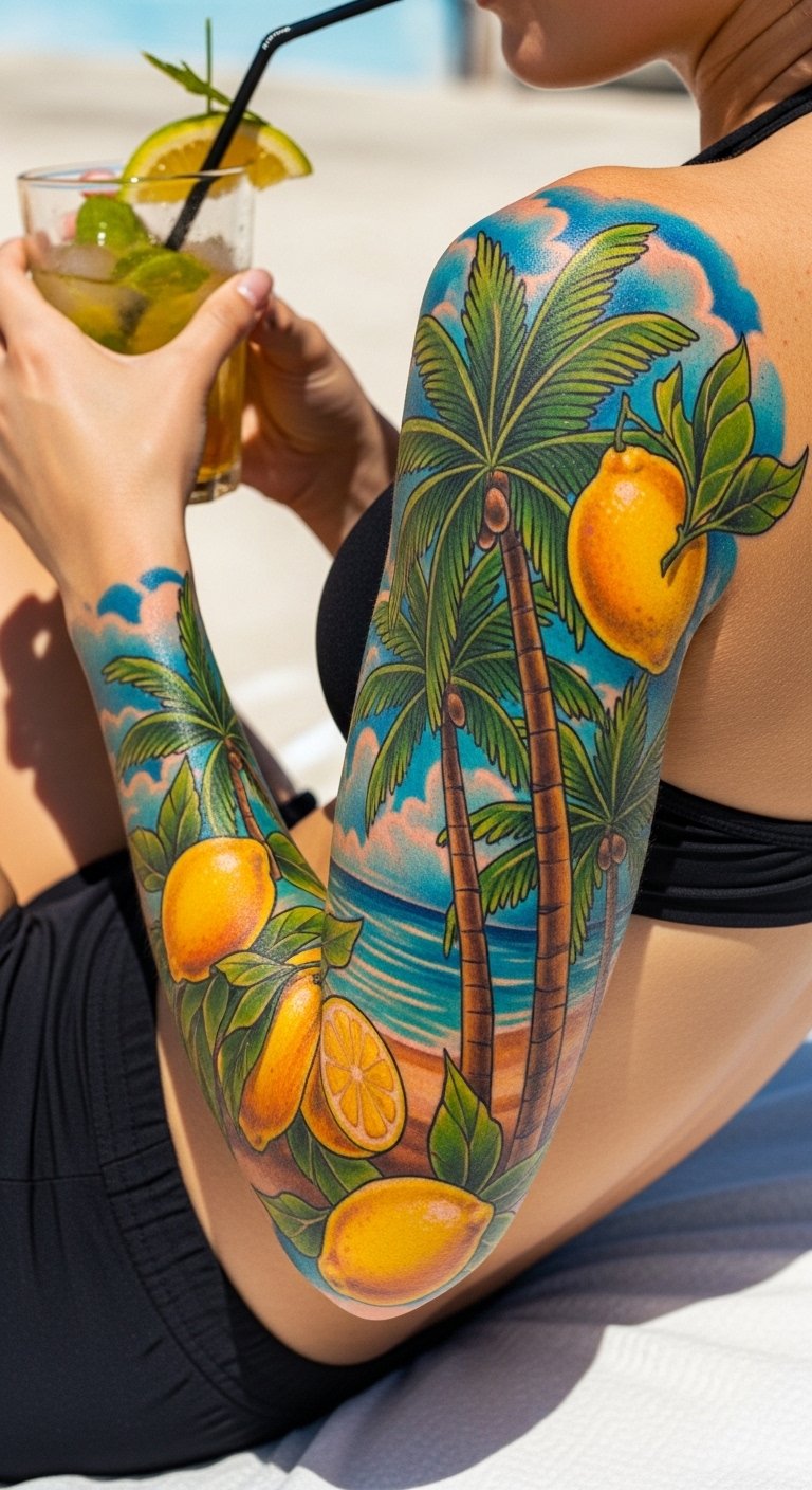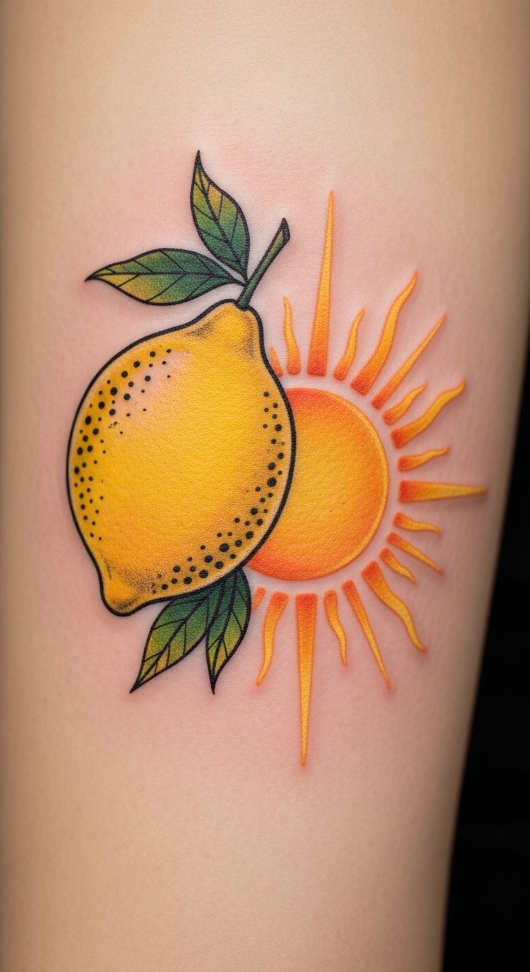 This design blends lemon and sun imagery to symbolize warmth, renewal, and playful optimism; the bright yellows and soft greens evoke energy and freshness while the sun rays suggest vitality and protection. Emotionally it reads as cheerful and uplifting, suited to placements that catch light and movement—forearm, shoulder blade, ankle, or ribcage—to showcase the circular sun and cascading lemon slices in a composition that follows the body’s curves.