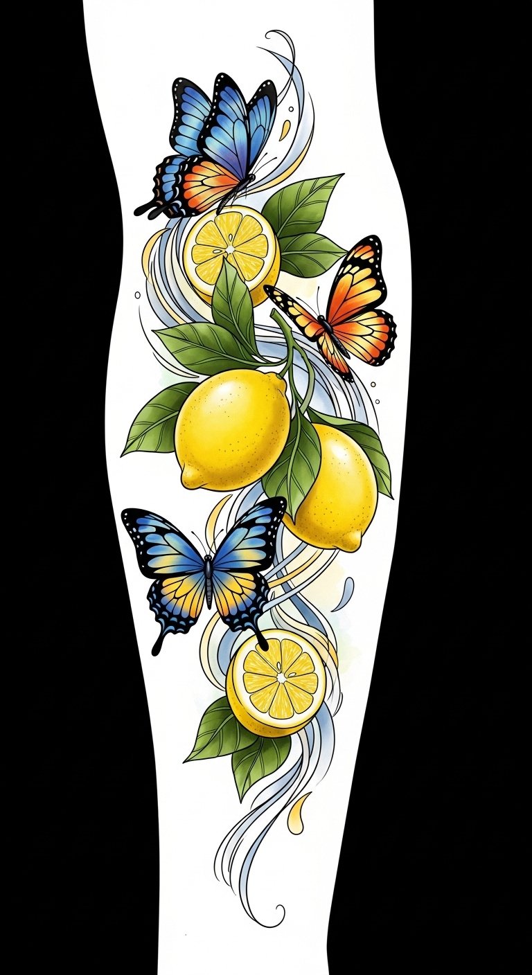 Delicate yet bold, this design marries bright, sunlit lemon hues with finely detailed butterfly wings to convey renewal, optimism, and personal growth; it radiates playful energy and serene movement, making it ideal for placement on the forearm, shoulder blade, or ankle where the composition can flow with the body and be shown or concealed as desired.