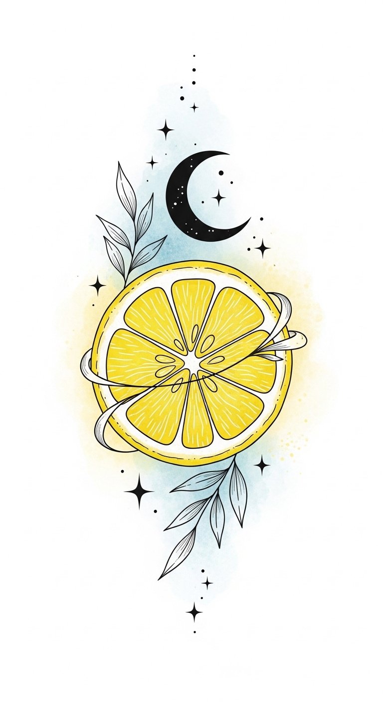 Place this piece on the inner wrist, ankle, or behind the ear to evoke playful optimism and quiet wonder; the lemon conveys vitality and renewal, the moon and stars suggest guidance and dreams, producing a balance of earthly joy and celestial aspiration.