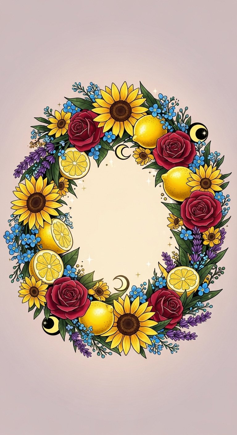 The design marries bright citrus and soft petals to symbolize renewal, optimism, and creative freedom; the wreath form suggests unity and the cyclical nature of life while celestial touches (tiny stars or subtle halos) add a sense of wonder and transcendence.