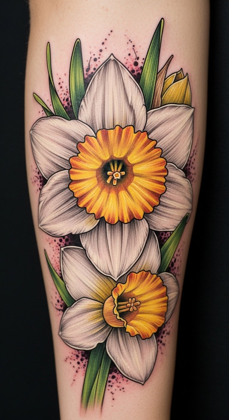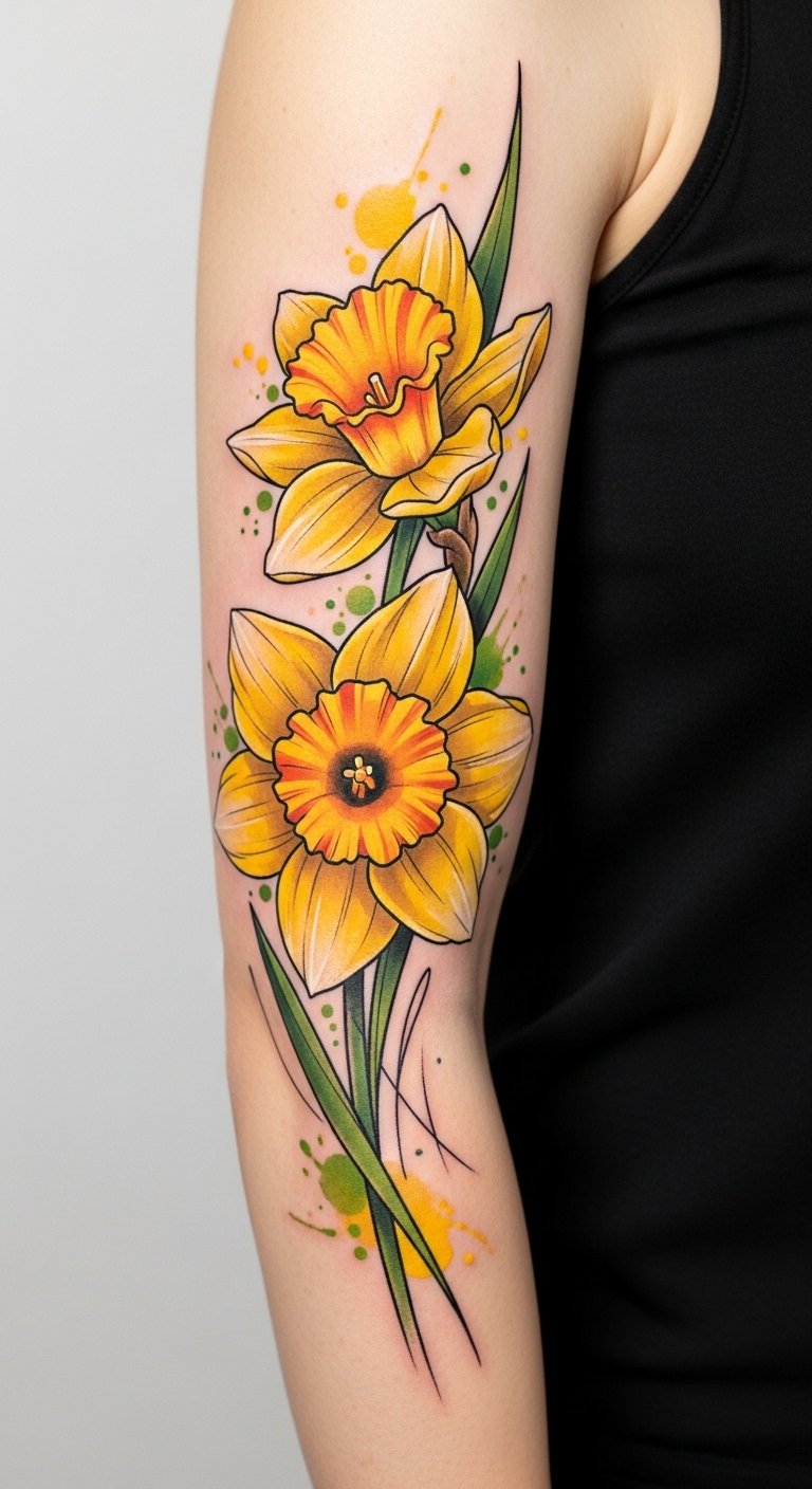 A splash of color can transform a daffodil tattoo into a mesmerizing piece of art that dances across your skin.