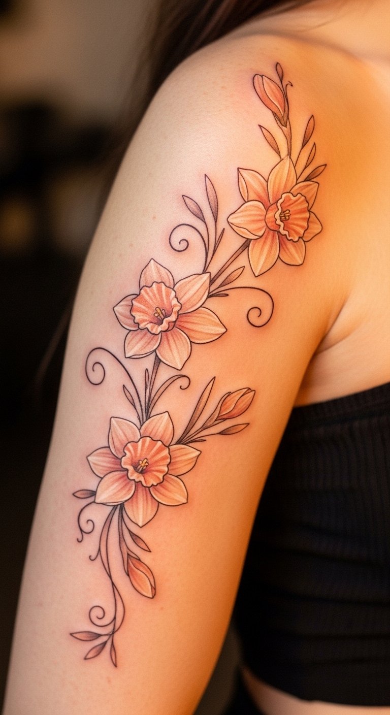 Peach and apricot daffodil imagery evokes renewal, admiration, and joyful freedom—ideal for a forearm wrap, shoulder bloom, or ankle garland where the soft colors can follow natural contours. Use gentle watercolor washes for the petals, fine-line stems and subtle highlights to convey tenderness and movement; placement near the heart or along the collarbone emphasizes personal growth and blossoming relationships, while a sleeve or ribcage composition can tell a broader life-story of vibrant moments and connections.