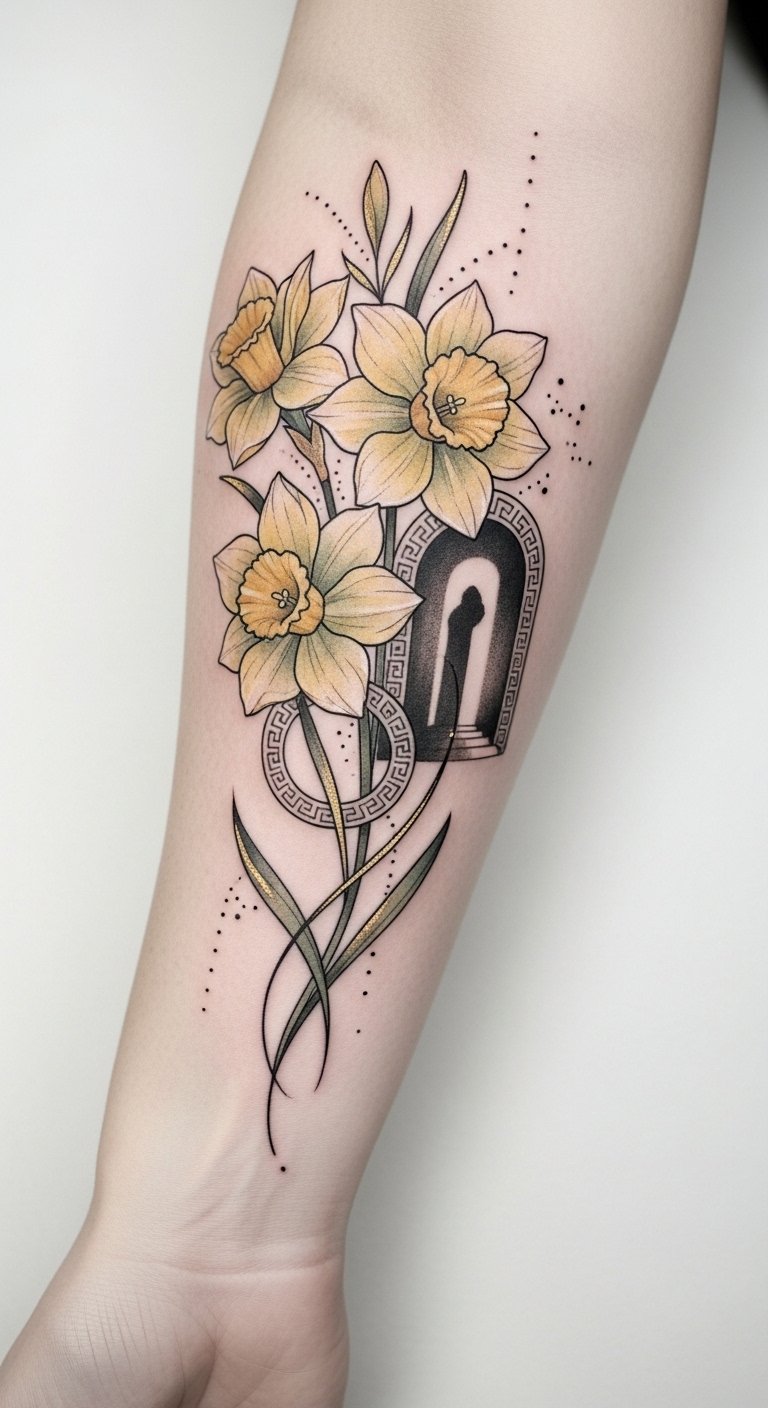 Adorning yourself with daffodil tattoos connects you to this timeless narrative of transformation. This design emphasizes renewal and passage through a quiet, hopeful mood—perfect for the inner forearm or along the ribcage where the vertical flow of stems can follow natural lines; the Greek key hints at cultural roots while watercolor tones keep the piece tender and intimate.