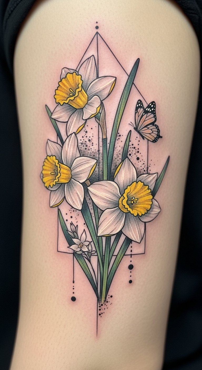 The design blends minimalist daffodil outlines with soft watercolor fills and a few geometric accents—small triangles and fine-line circles—to balance organic and structured elements; a delicate butterfly rests on one petal to symbolize transformation and freedom. Emotional tones are tender, hopeful, and liberating, evoking renewal and personal growth; color choices favor warm yellows, pale oranges, and muted greens with watercolor bleeds for a lively, springlike feel. Ideal placement: inner forearm or clavicle for visibility and intimacy, or along the ribcage for a more private, flowing composition.