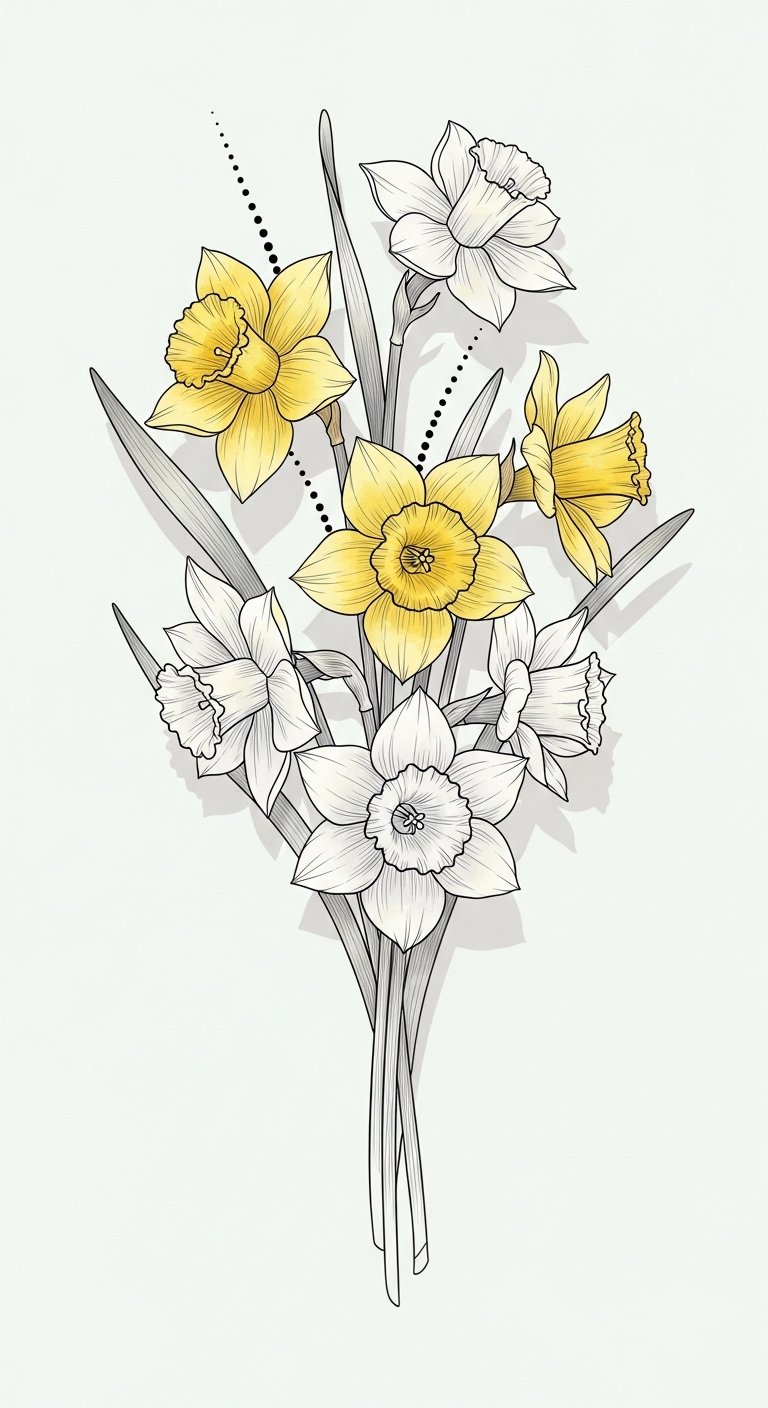 Picture delicate minimalist linework forming geometric daffodils, capturing their essence without excess. These designs embrace freedom, allowing your personality to shine through.