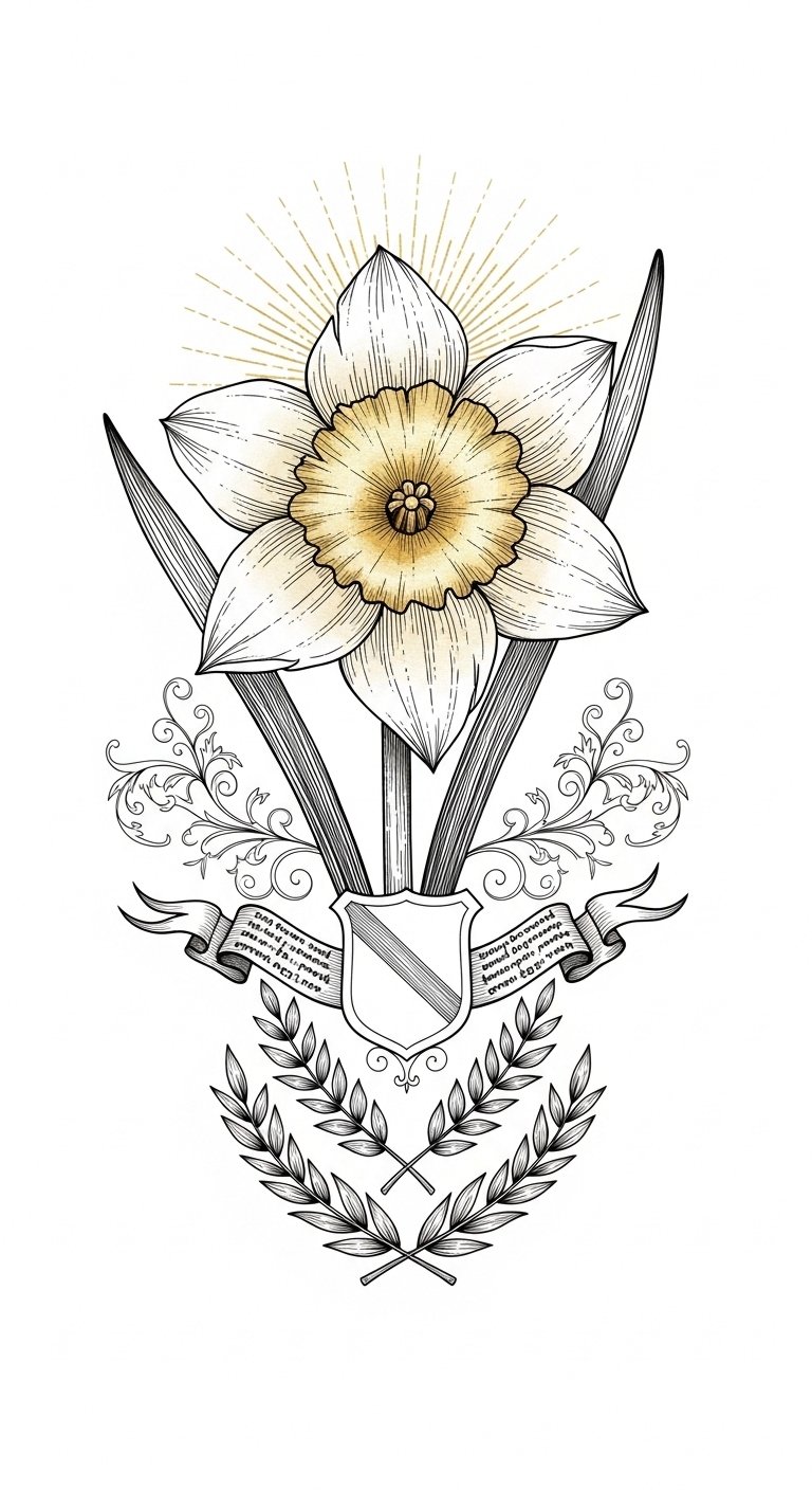 The daffodil’s vibrant beauty goes beyond its role as a symbol of renewal and hope; it also embodies the ideals of chivalry and regard. Daffodil respect flourishes in relationships, encouraging you to honor those you cherish. This chivalric symbolism inspires acts of kindness and loyalty, reminding you that true strength lies in uplifting others, creating a harmonious connection that celebrates love and admiration. The design conveys noble emotion—gentle devotion and protective warmth—suitable for the outer forearm or upper shoulder where it can be both visible and intimate, evoking personal vows of respect and service.