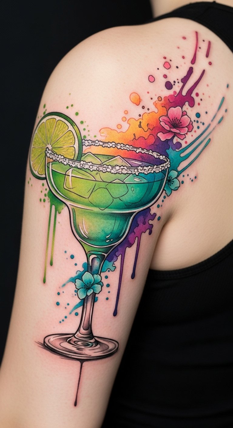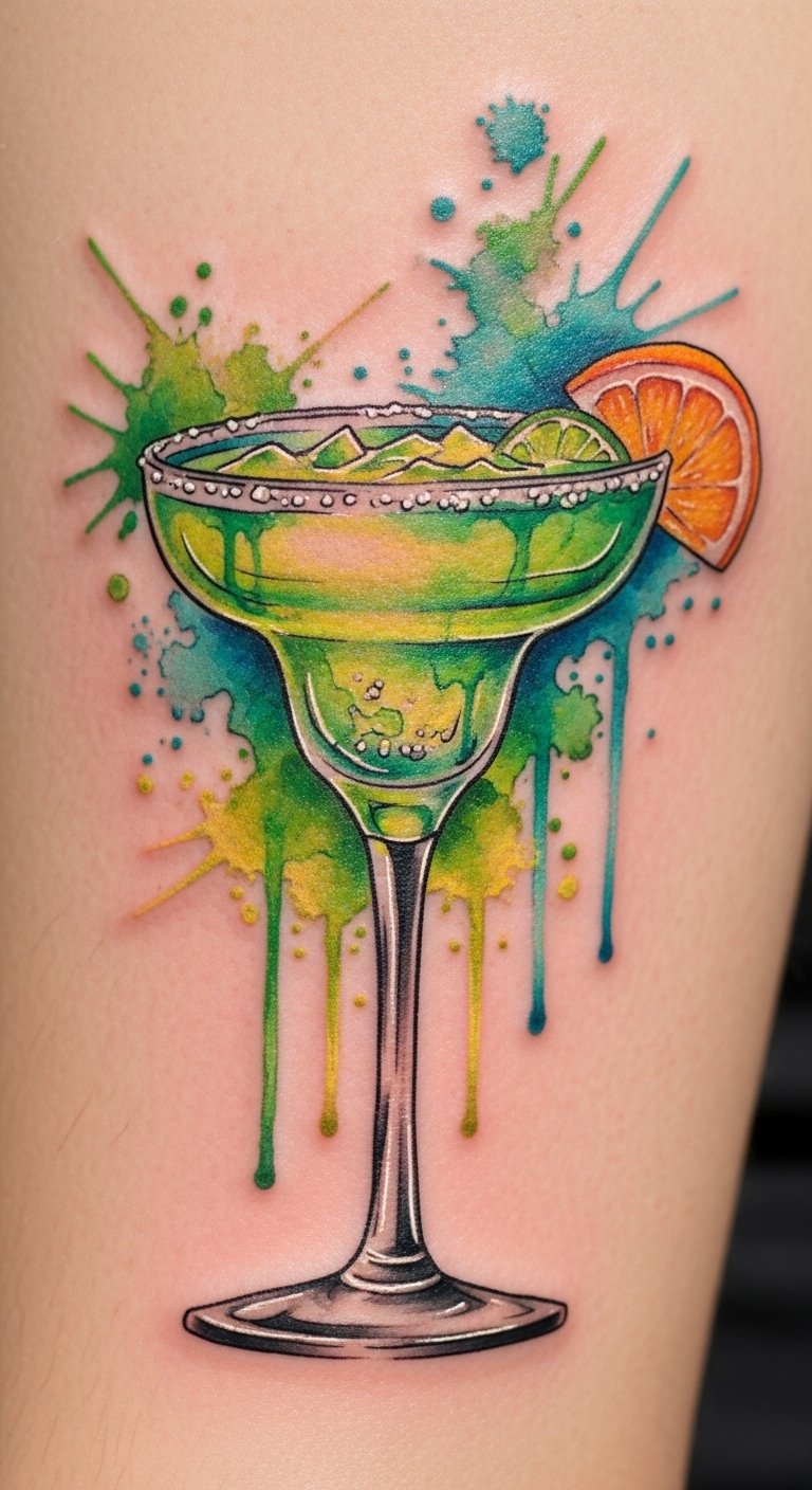 A striking blend of realism and whimsy, a half-realistic, half-watercolor margarita tattoo can transform your skin into a vibrant canvas.