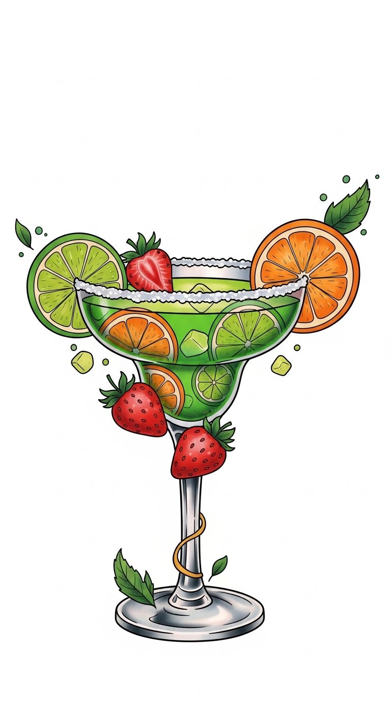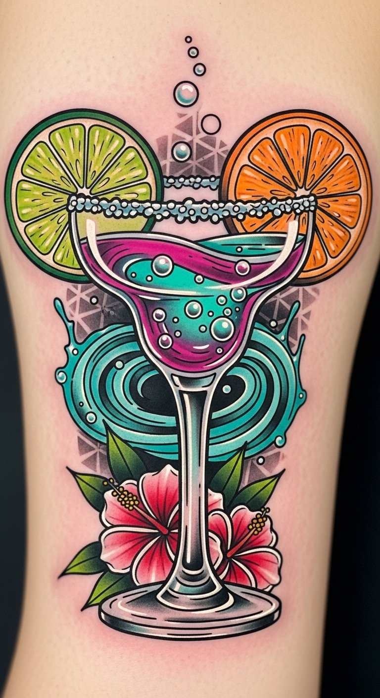 Embracing a vibrant twist on the classic margarita, a neo-traditional tattoo design featuring fruit garnishes captures the essence of indulgence and celebration.